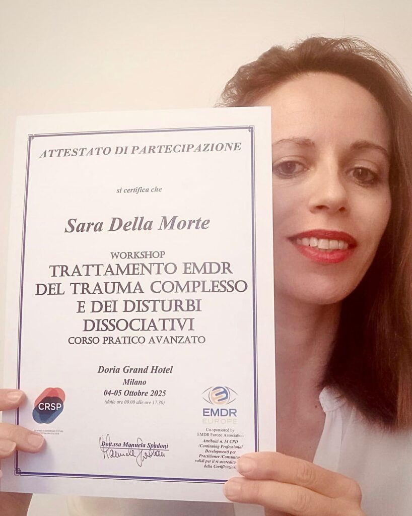 L’EMDR (Eye Movement Desensitization and Reprocessing) è una tecnica terapeutica efficace per la rielaborazione dei traumi, che aiuta a ridurre l’impatto emotivo di esperienze dolorose o traumatiche. Il corso avanzato ha permesso di approfondire in particolare l’applicazione dell’EMDR nei casi di trauma complesso — quando le esperienze traumatiche si sono protratte nel tempo o sono avvenute in età precoce — e nei disturbi dissociativi, che possono derivarne. L’EMDR è uno degli strumenti che utilizziamo nel lavoro clinico, quando è utile nel percorso del paziente: puoi approfondire l’argomento nella pagina dedicata a Strumenti e Pratiche.