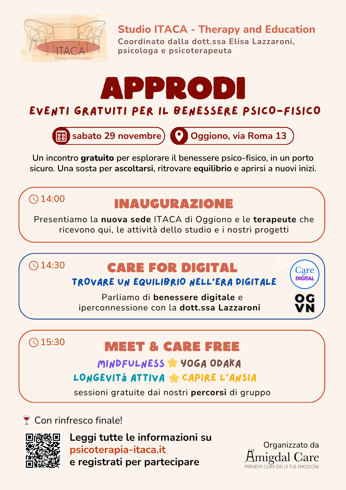 Inauguriamo la nostra nuova sede di Oggiono con una giornata aperta a tutti per parlare di benessere in compagnia degli specialisti del nostro team. Confrontiamoci sui temi del benessere digitale e dell’impatto della tecnologia sulla nostra salute mentale, approfondiamo i meccanismi che originano stress e ansia e riflettiamo su cosa significhi invecchiare e cosa si intenda per Longevità attiva. Proviamo insieme alcune pratiche utili per il benessere, come la Mindfulness e l’Odaka Yoga. Tutte le attività sono condotte da terapeute e personale specializzato!